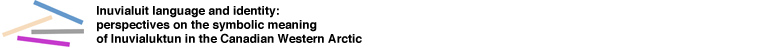 Current Inuvialuktun language teaching materials are designed largely around a knowledge of traditional Inuvialuit culture. By learning about traditional Inuvialuit subsistence skills, language is deliberately brought together with a sense of identity that finds its roots in an ancestral heritage closely tied to life on the land. By examining current and potential learners' perspectives of Inuvialuktun, and of themselves as contemporary Inuit, language planners are hoped to be able to better address the needs and interests of the student population based on data collected in this study.