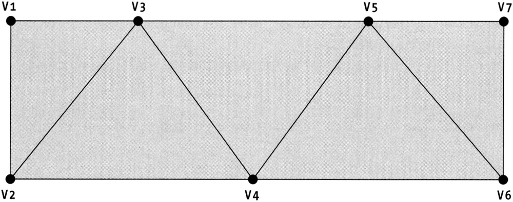 The triangle strip primitive is used if the last two vertices of each triangle are also part of the next triangle in the buffer. This provides a roughly 66 percent performance gain over the triangle list since only about a third as many vertices need to be transformed to screen coordinates. In order to use this primitive, we must model the object in this manner and make sure that the vertex buffer is packed properly. Triangle strips are most commonly used when rendering a rectangular region. Figure 3–4 gives an example of a triangle strip.