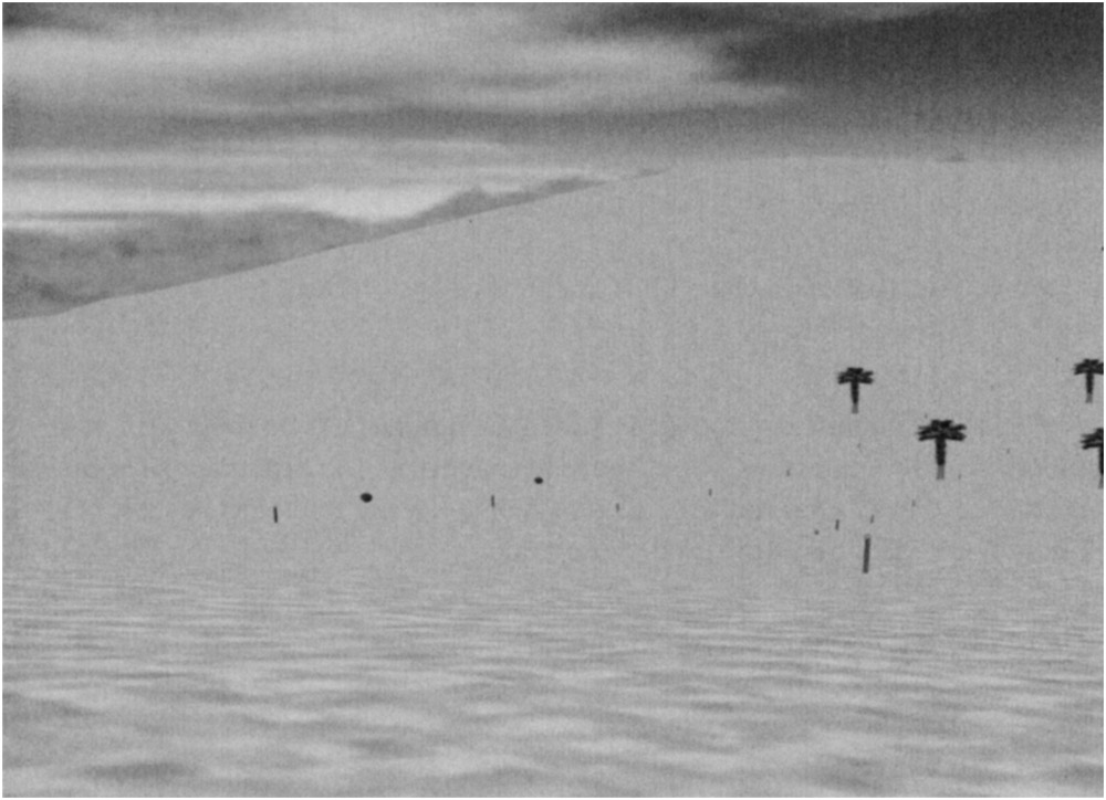 Now that we have our Billboard class, we can dress up the scene a bit. Figure 4–4 shows the new scene with a number of palm trees and cacti sprinkled across the sand. There are also a number of red and blue colored posts, which will be used in the finished game to mark the racecourse. We can see the difference that the billboards can make. We have a greater sense of the size of the database when we can see small objects off in the distance.