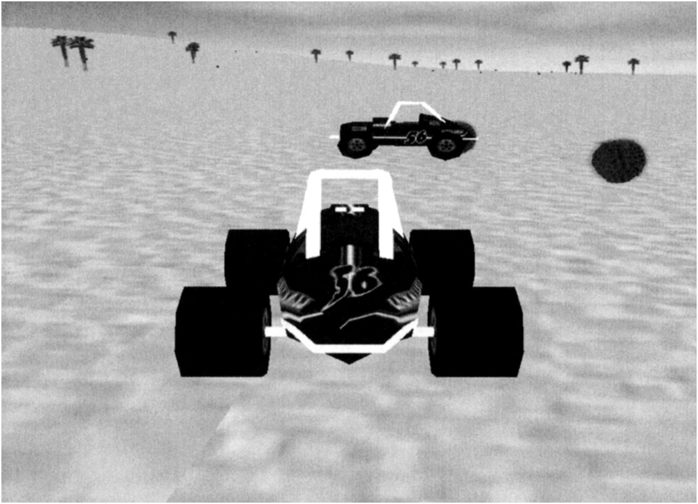 This chapter has been dedicated so far to the design of the Model class. Now let’s take a look at how a user of the game engine might interact with models within a game. To use a model within the game, we need to do several things. We need to create the model and give it to the game engine so that it may be managed and rendered. We must also perform any initial setup of the model. This all comes under the heading of instantiating the model, and will typically be done in the background task started while the developer splash screen is being displayed. This is the same routine that loads the terrain and billboards. Figure 5–1 shows our sandy terrain with billboard trees and cacti. It also shows two cars that we have added using the Model class.