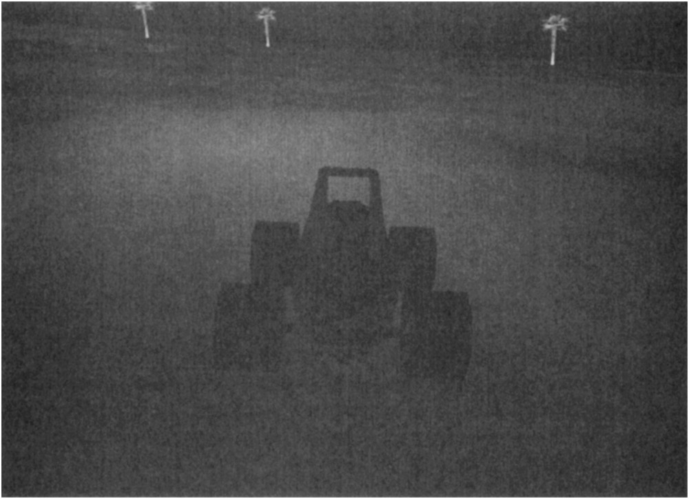 So far in the chapter we have discussed some theory behind lights as used in the game engine as well as the implementation of the GameLights class for the game engine. Now we will see how easy it is to actually use the lights. The example code in Listing 7–14 illustrates how the lighting is set up in the game application’s LoadOptions routine. Setting the ambient light is done simply by setting the Ambient property of the GameLights class to the desired value. An RGB value of all 20s gives a fairly dark scene. We will then create a spot light and attach it to the ownship. The ownship is a reference to the vehicle model that we will be driving around the scene. The term comes from the simulation and training world, where the vehicle being simulated was traditionally an aircraft. Once the light is created, configured, and attached to a vehicle, there is nothing else we need to do with it. It will automatically travel around the scene with the vehicle and illuminate the terrain and other objects before it as it moves along.
