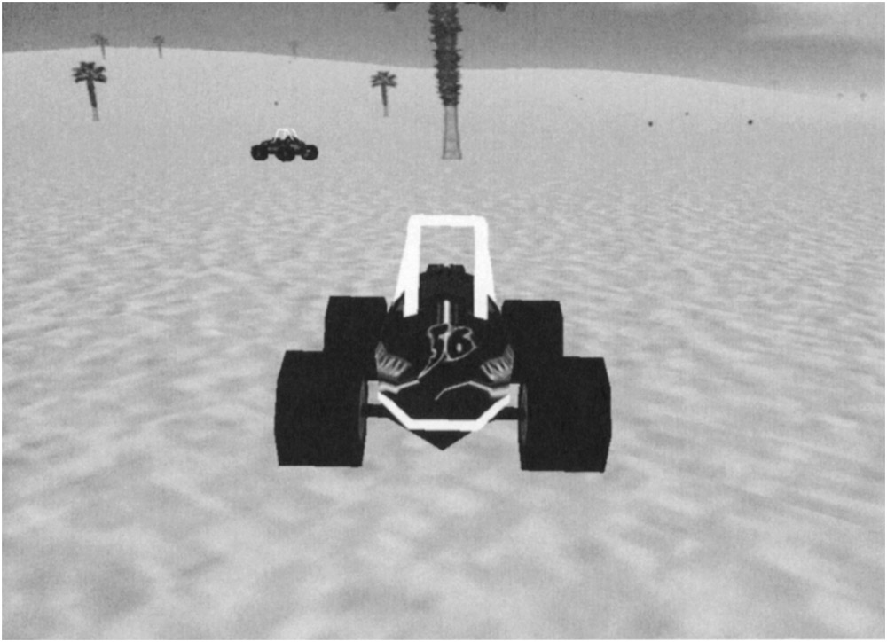 The color we use for fog should ideally blend well with the sky color at the horizon. We can also use the fog for an environmental look. Let’s say we are creating an underwater game. Aqua-green fog would help to give an underwater look. The code in Listing 7–16 shows how we could configure fog through the game engine’s static properties. We will use some beige fog for that windblown sand look. Figure 7–5 shows what our scene looks like with these fog settings. We’ve gone back to day lighting so that we can properly see the fog.